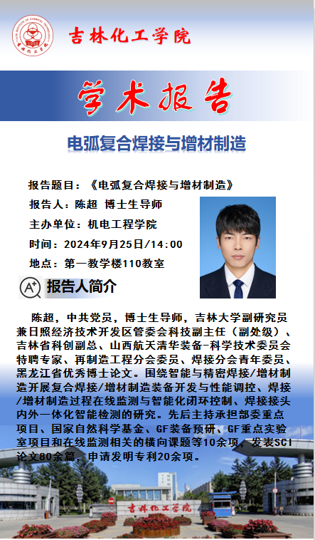 为深入落实OBE教学理念,推动校际间的学术交流与合作,促进“双师双能型”教师培养与研究生学术水平提升,2024年9月25日,我院特邀请材料成型专业2014届毕业生,吉林大学材料科学与工程学院博士生导师、吉林大学副研究员,兼日照经济技术开发区管委会科技副主任(副处级)、吉林省科创副总、山西航天清华装备-科学技术委员会特聘专家、再制造工程分会委员、焊接分会青年委员陈超校友,为yl6776永利集团教师、硕士研究生做题为《电弧复合焊接与增材制造》的学术报告,报告会结束后,到材料成型专业实验室进行现场技术指导与交流。