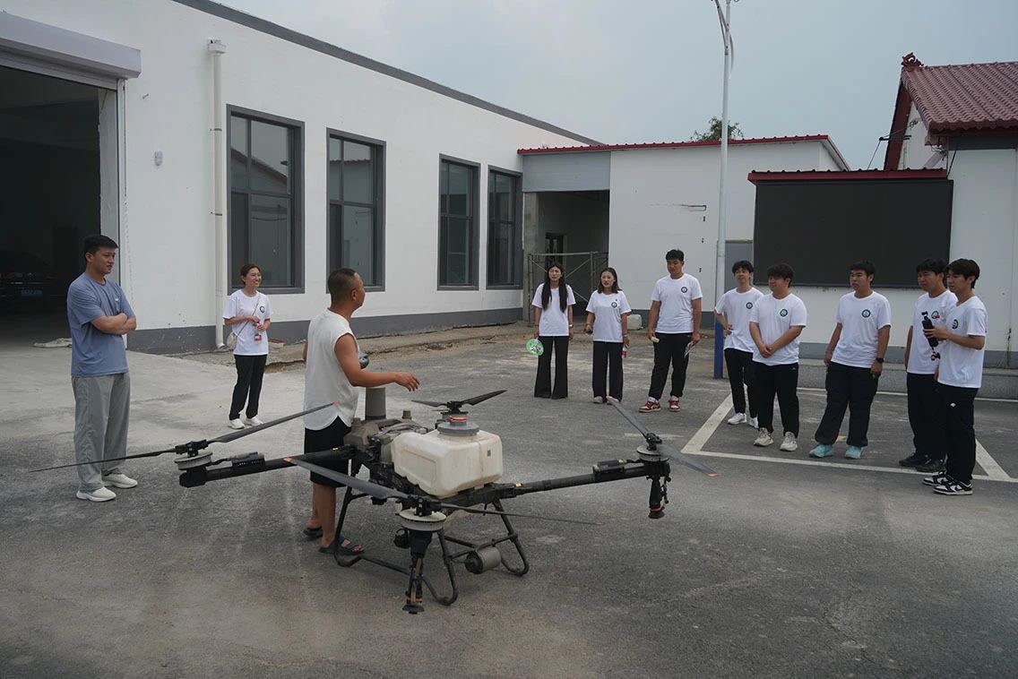 随后,合作社负责人张帅为实践团展开科技助农讲解。先是介绍大型机械化设备在水稻田间的作业应用,从耕整到植保,展现高效流程。接着重点演示大型无人机巡视,展示操作流程,讲解如何借航拍监测水稻长势、排查农田状况,尽显科技赋能农业的智慧。