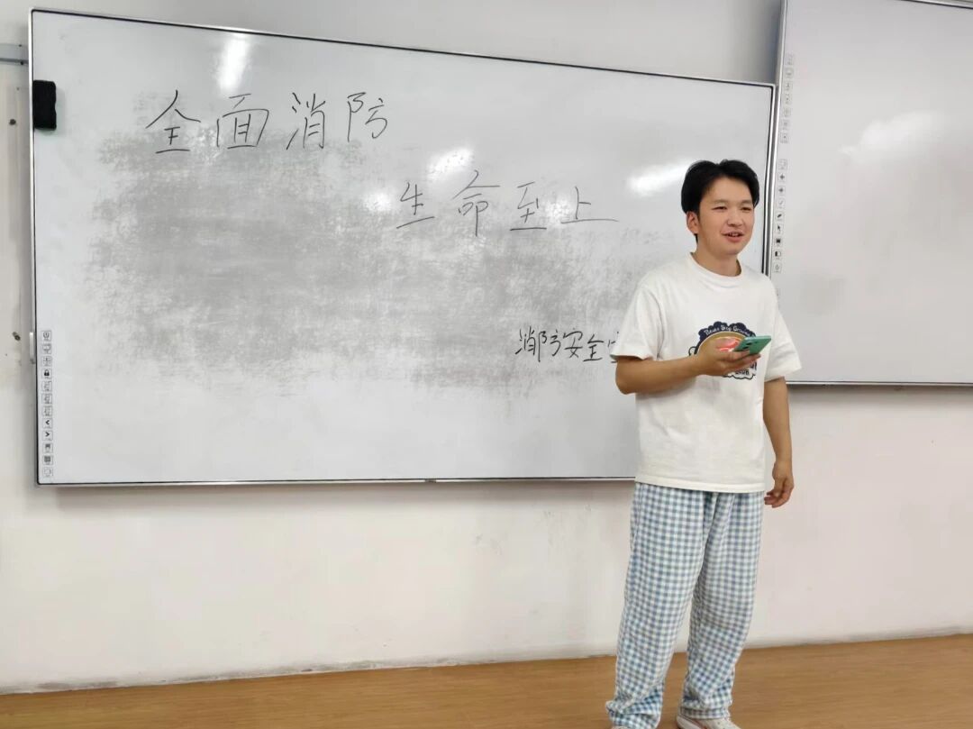在案例警示的基础上,班会进入系统讲解环节。班长围绕“预防—灭火—逃生”三大模块,详细讲解宿舍用电规范、初起火灾扑救方法、灭火器使用要领及火场疏散注意事项,帮助学生构建从意识到实践的全方位安全能力,动员每一位同学成为“平安校园携手共建”的参与者和守护者。